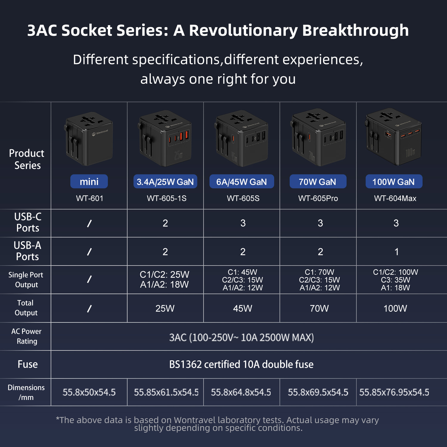 Wontravel Mini GaN 70W Multi Plug 3AC Sockets Travel Adaptor Worldwide Charger International Universal Travel Adapter 8 in